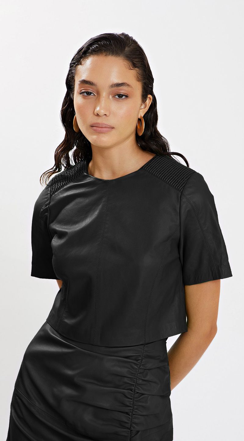 Blusa Iódice Decote Redondo Manga Curta Detalhe Nervura Preto