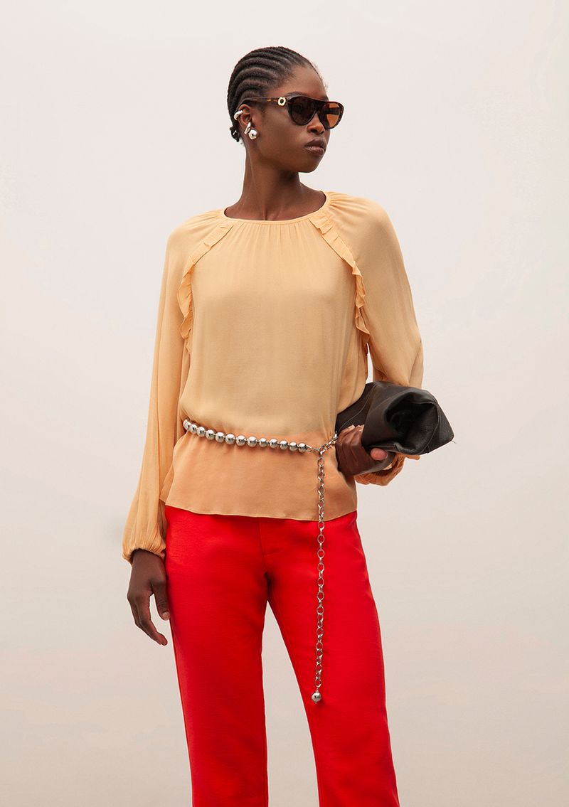 Blusa Iódice Decote Redondo Manga Longa Com Babado Marrom