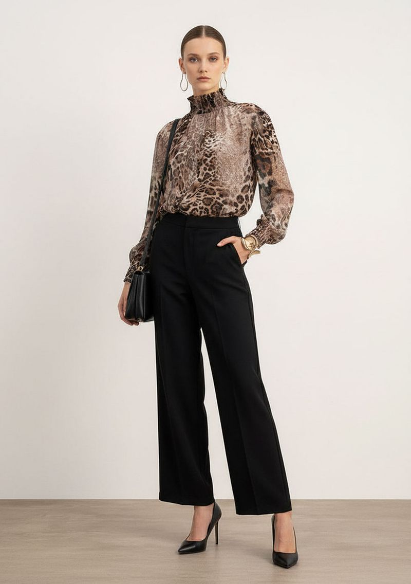 Blusa Solta Gola Alta Manga Longa Padrão Marrom