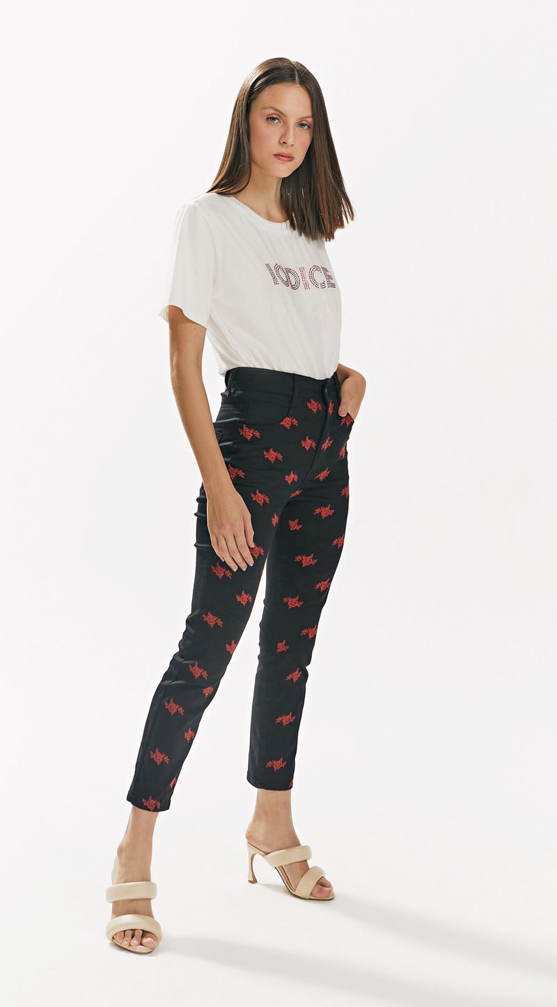 Calca Iódice Cigarrete Cós Alto Bordado Industrial Preto