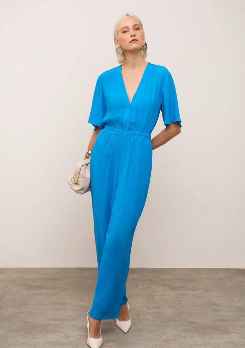 Macacão Iódice Solto Decote V Manga Curta Longo Azul