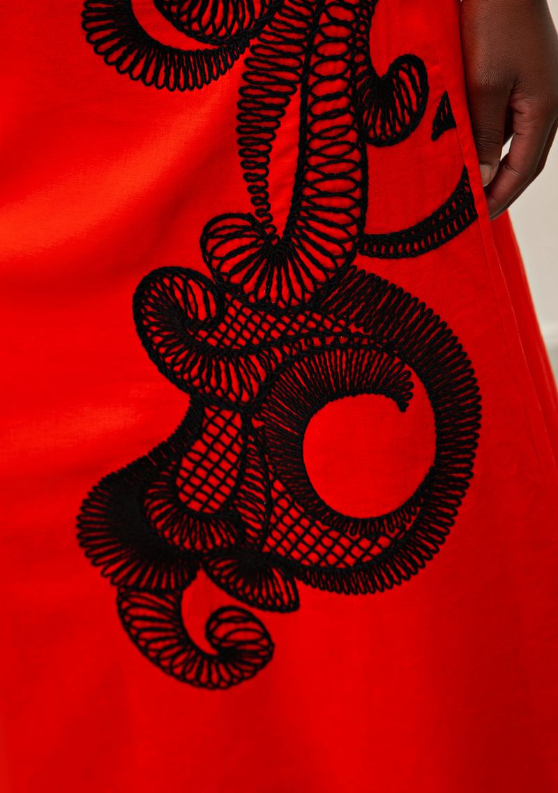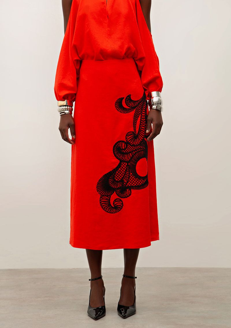 Saia Iódice Midi Reta Com Bordado Vermelho