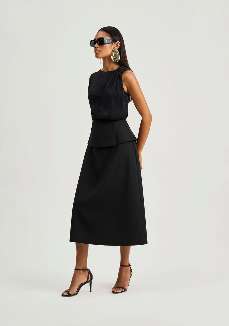 Saia Iódice Reta Alta Midi Preto: uma peça que exala sofisticação e feminilidade, perfeita para transitar do dia à noite com elegância. Com design neoclássico, sua silhueta reta e cintura alta oferecem um caimento impecável, enquanto o comprimento midi garante versatilidade. Feita com 98% poliéster e 2% elastano, proporciona conforto e leveza. Ideal para combinar com blusas estampadas ou camisas estruturadas, e acessórios dourados para um toque de glamour. Perfeita para ocasiões casuais que pedem estilo e confiança. Deixe-se envolver pela coleção que une tradição e modernidade, destacando sua personalidade em cada detalhe. *Os acessórios não acompanham a peça.*