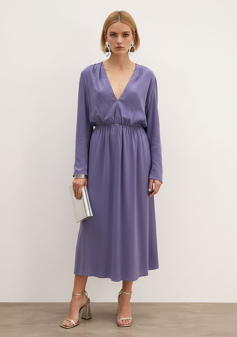 O Vestido Ajustado Decote V Manga Longa Midi Lilás da coleção Soirée é a escolha perfeita para momentos que exigem sofisticação e presença. Confeccionado em crepe de alta qualidade, ele abraça suavemente o corpo, valorizando suas curvas com um ajuste impecável. O decote em V e as mangas longas conferem elegância e versatilidade, tornando-o ideal tanto para festas quanto para ocasiões casuais. Combine-o com acessórios delicados, como brincos de pérola e sandálias de salto, para um look deslumbrante em um jantar especial. Para um visual mais descontraído, aposte em tênis brancos e uma jaqueta jeans. O lilás, uma cor suave e contemporânea, traz frescor e leveza ao seu guarda-roupa de outono/inverno. Celebre sua essência e faça cada instante memorável com este vestido que une estilo e conforto. A peça é uma verdadeira declaração de moda que te convida a brilhar sem esforço. Os acessórios não acompanham as peças.