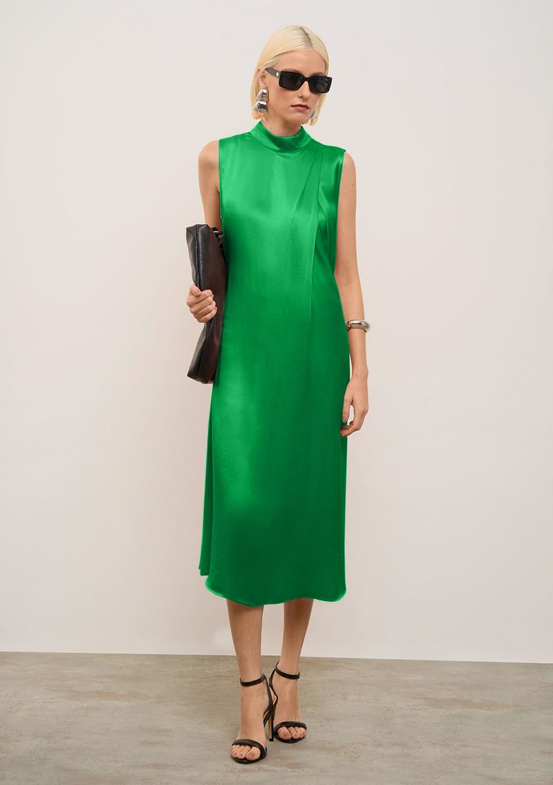 Combine-o com acessórios delicados, como um colar de pérolas e sandálias de tiras, para um visual mais refinado, ou aposte em uma jaqueta de couro e ankle boots para um estilo mais despojado. O tom verde vibrante traz frescor e é uma excelente escolha para a temporada de Primavera/Verão 2025, fazendo parte da coleção Soirée, que celebra momentos inesquecíveis.