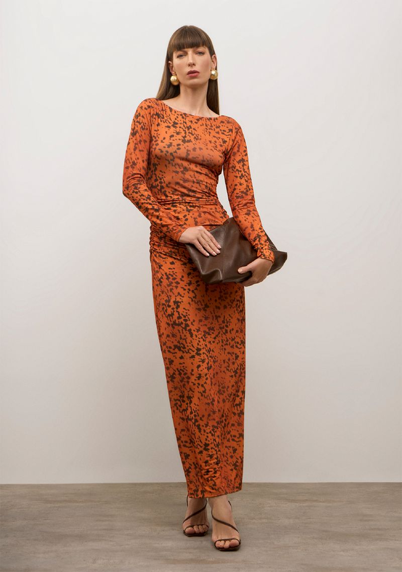 Desperte sua elegância com o Vestido Iódice Ajustado Gola Alta Manga Longa Longo Laranja. Parte da Coleção EDGE OF LIGHT, este vestido longo exala sofisticação com seu design autoral e cor vibrante que destaca sua presença em qualquer ocasião, seja casual, festa ou dia a dia. A gola alta e as mangas longas garantem um toque de classe, enquanto o tecido de poliéster e elastano envolve seu corpo, proporcionando conforto e confiança. Combine com acessórios neutros para um look equilibrado ou aposte em peças brilhantes para um visual ousado. Ideal para eventos noturnos, este vestido é a escolha perfeita para momentos especiais. Os acessórios não acompanham a peça.