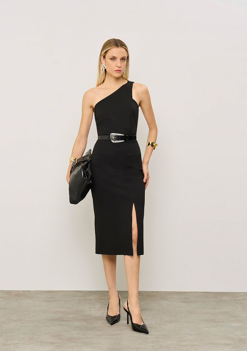 Vestido Iódice Ajustado Um Ombro Só Com Alça Midi Preto