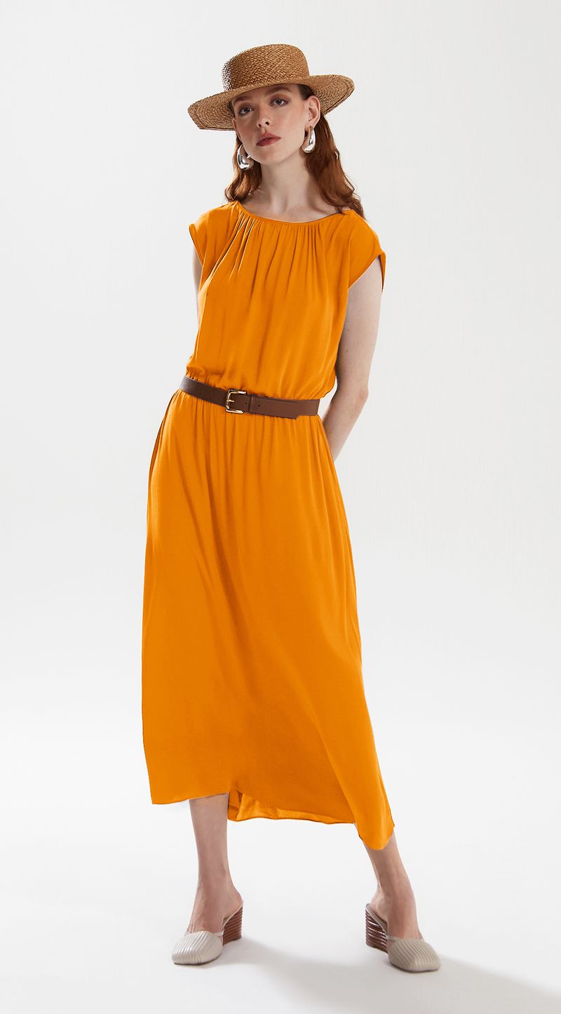 OUTLETColeçõesVestidosVestido Iódice Midi Decote Franzido Canaleta Cintura Laranja