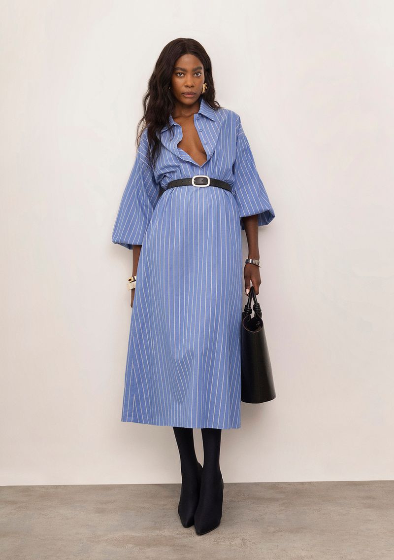 OUTLETColeçõesVestidosVestido Iódice Solto Decote V Manga 3 Quartos Midi Azul