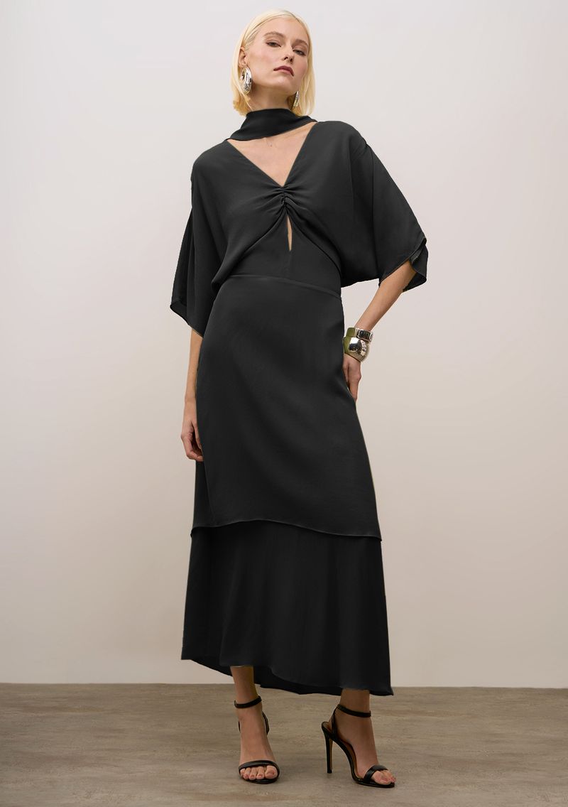 Vestido Iódice Solto Decote V Manga Longa Midi Preto